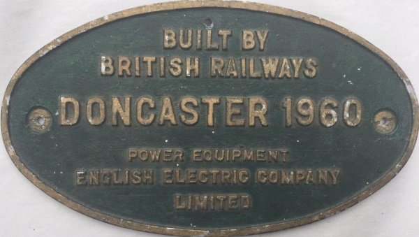 Alloy Electric Locomotive Worksplate "BRITISH RAILWAYS DONCASTER 1962". As carried by Class 85 85013. New to ACL 5/5/62 numbered E3068. Renumbered to 85013 8/73 and Withdrawn due to fire damage 17/10/90. Cut up at M C Metals Glasgow 6/93.Rectangular Alloy. Front repainted. Guide: £800-1500 |